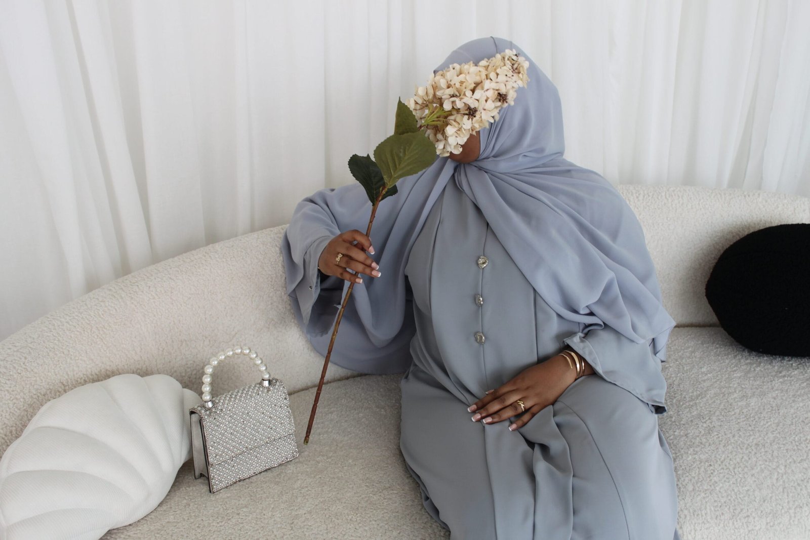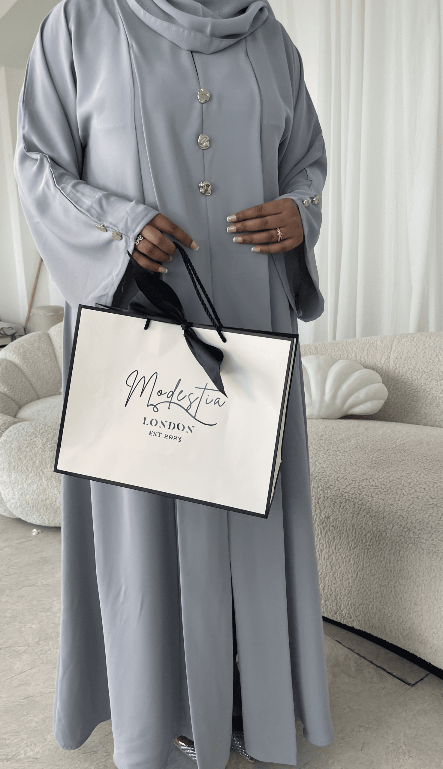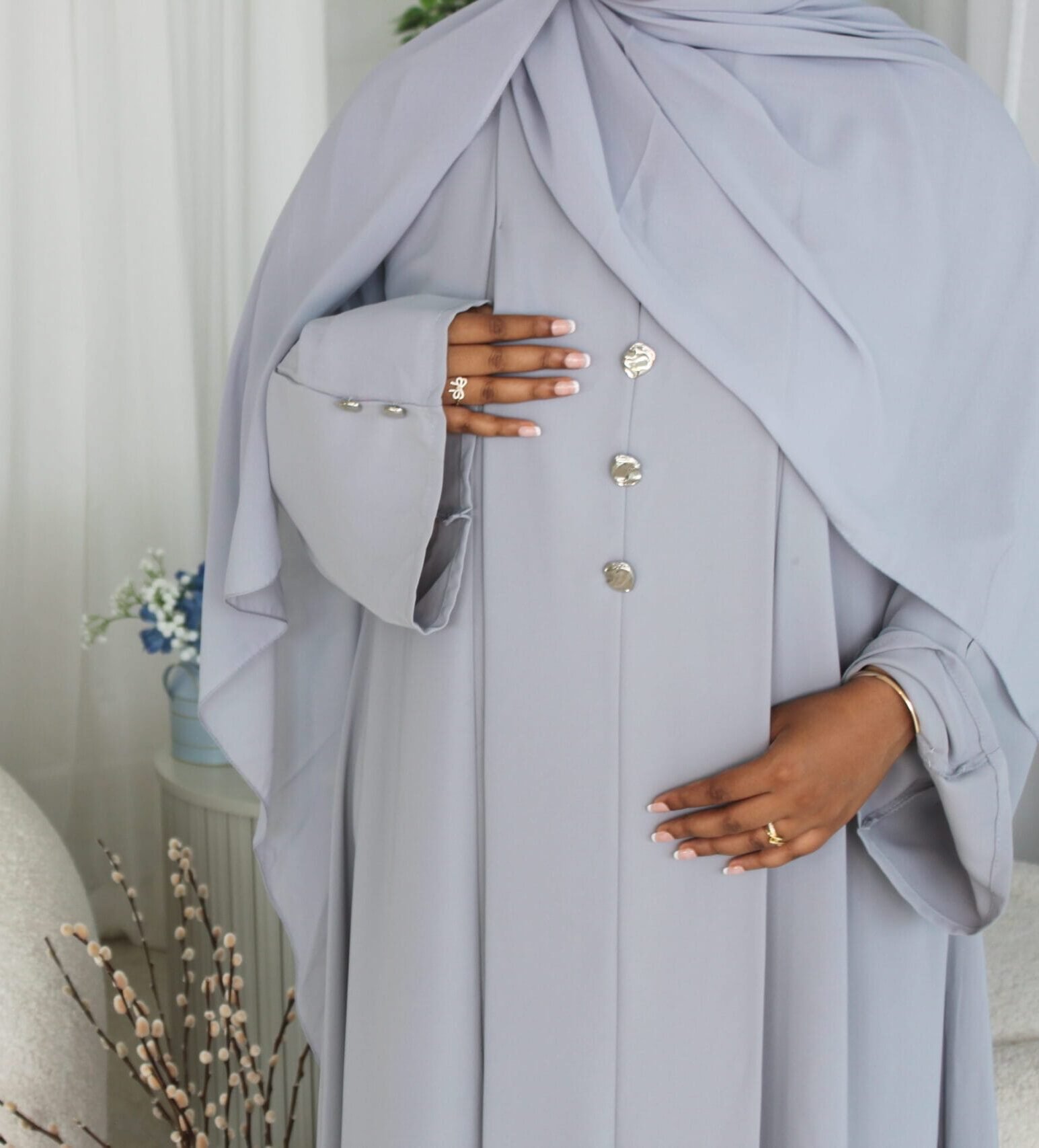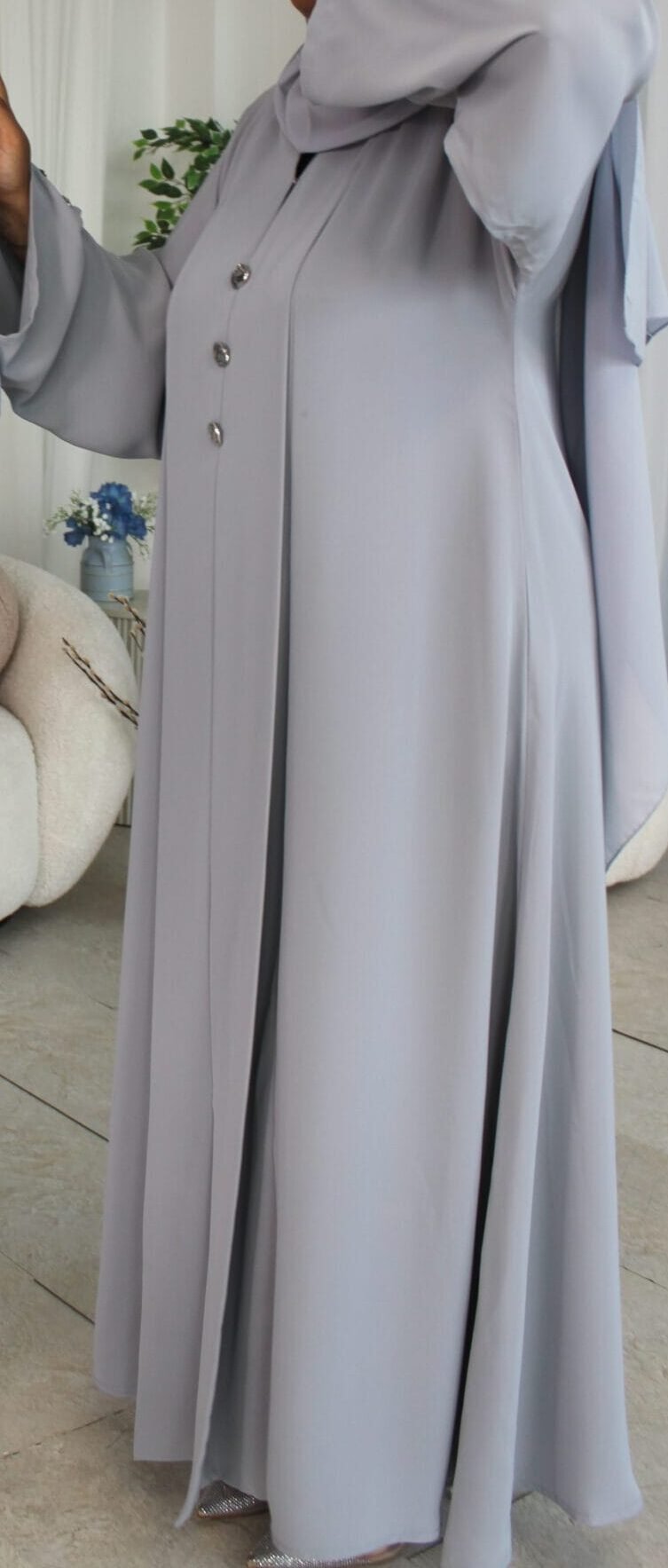 -The abaya is a one piece closed abaya with silver button detailing